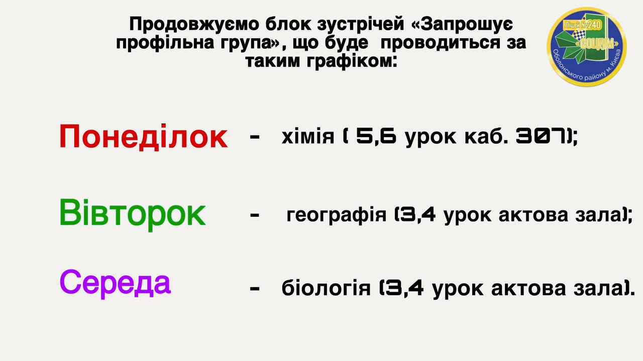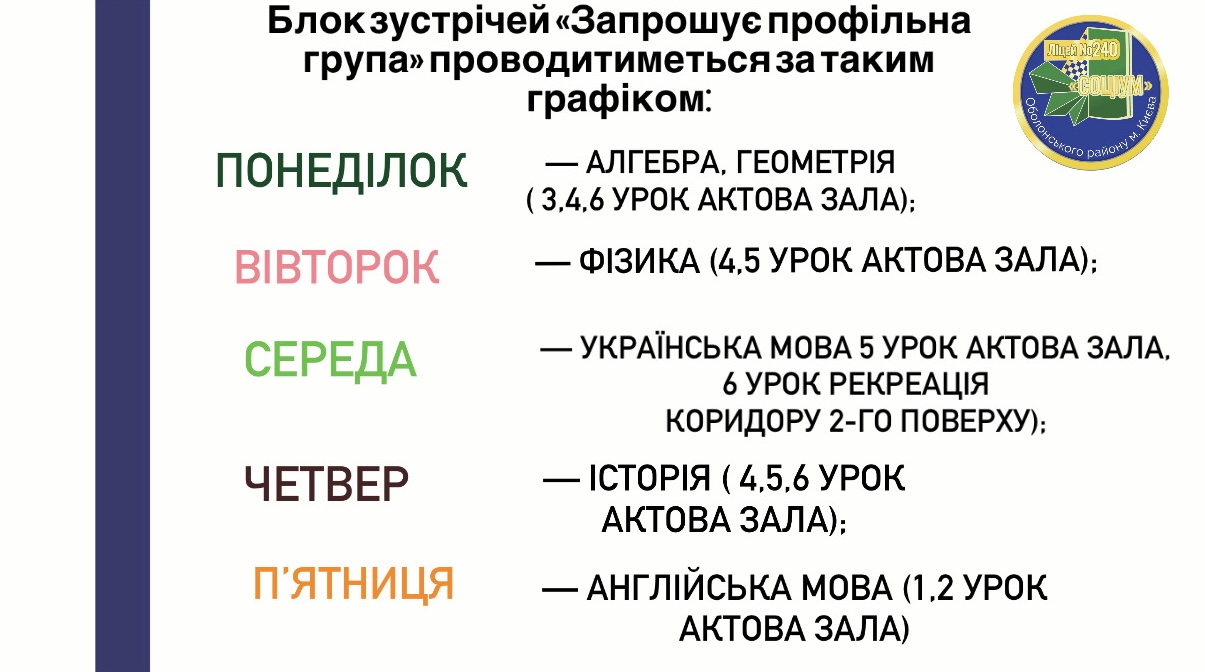 Шановні батьки та учні Ліцею 240 «Соціум»! З 02 лютого 2026 лютого розпочинається освітній процес для 1-11 класів: для 1-5-х, 11-х класів в очному форматі, для 6-10-х кл – у змішаному форматі з чергуванням очних/дистанційних днів відповідно до затвердженої моделі.